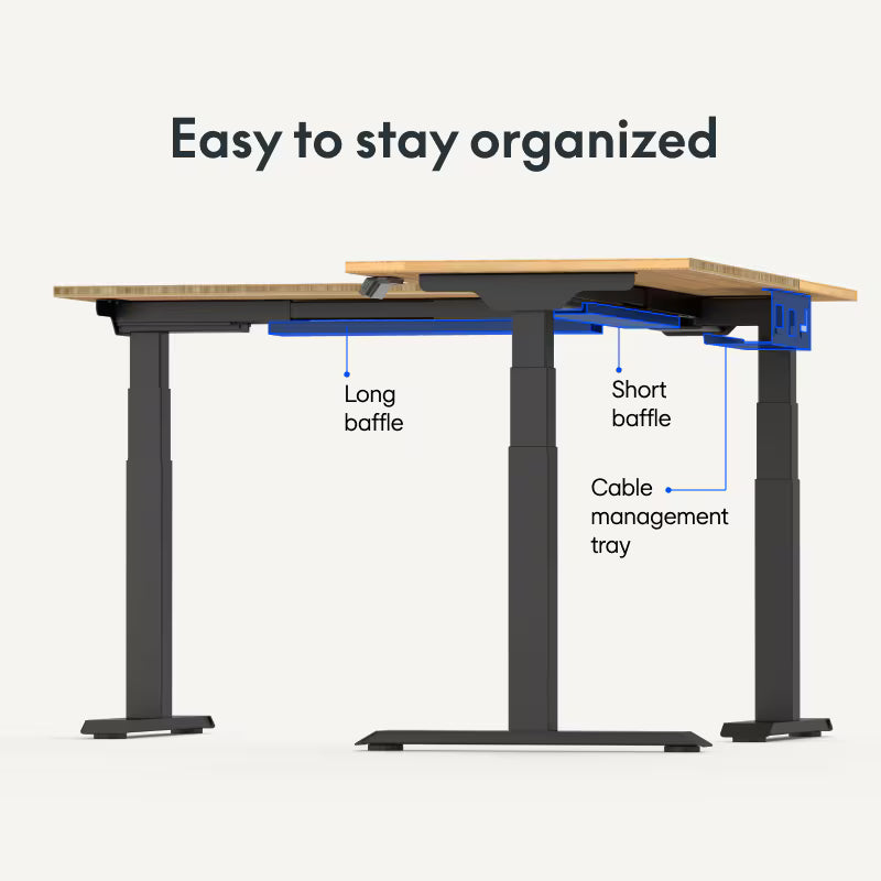 Unlock a corner office setup with unmatched space and ergonomic control. With three synchronized electric motors, this desk glides smoothly between sitting and standing across its expansive L-shaped surface. Robust enough for heavy setups, it features safety enhancements, programmable presets, and a design that adapts to your space and workflow.