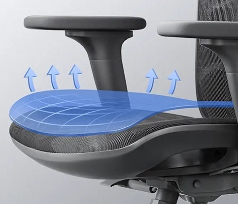 The chair's high-density mesh seat cushion provides comfort with a soft, waterfall design that conforms to your body. The front section, made of high-elasticity shaping cotton, reduces pressure on the buttocks and thighs, enhancing comfort.